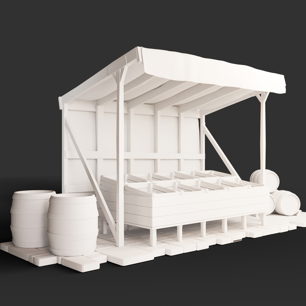 Detailed Medieval Market Vegetable Stalls Tent Pack fully textured, sculpted and rendered. Tent,Table,Barrel,Crate Stand,Stone, Crate empty.